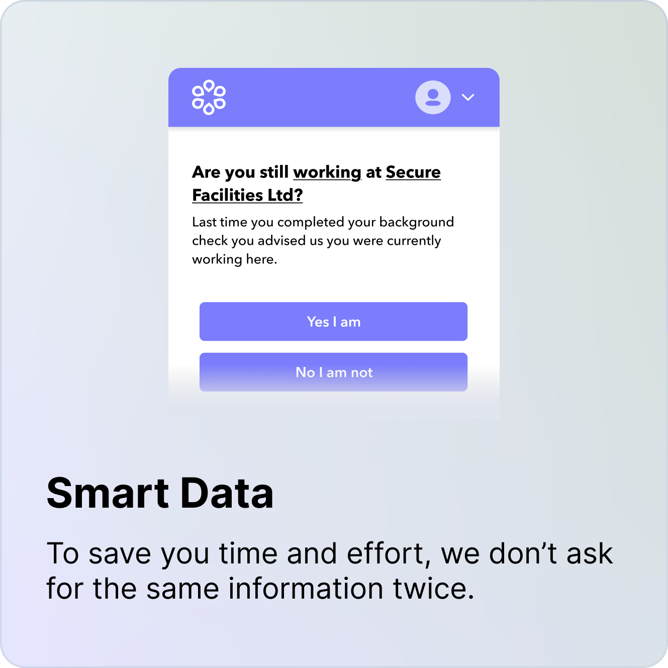 A computer screen displaying a digital form with a question asking if the user is still working at Secure Facilities Ltd. There are two blue buttons labeled "Yes I am" and "No I am not." The page has a section titled "Smart Data" with a message about saving time by not asking for the same information twice.