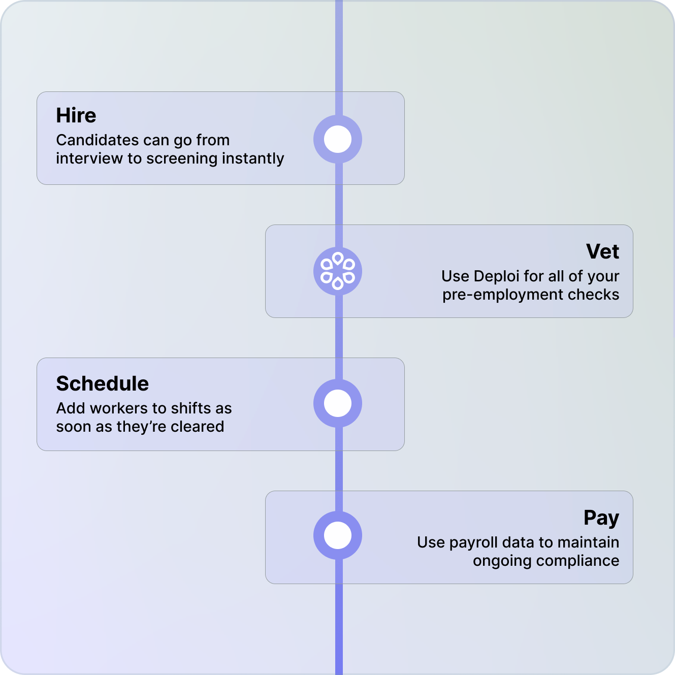 Deploi integrates effortlessly with your ATS, WFM, and Payroll systems. Experience the power of data sharing and automated workflows that save you time and reduce errors.